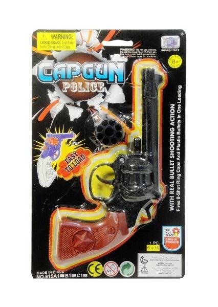 Plastikowy pistolet na spłonkę.Produkt zapakowany w kartonową podstawkę z przezroczystym kloszem. Zabawka dla dzieci od 8 lat. Podane wymiary stanowią wymiar opakowania. przeczytaj całość