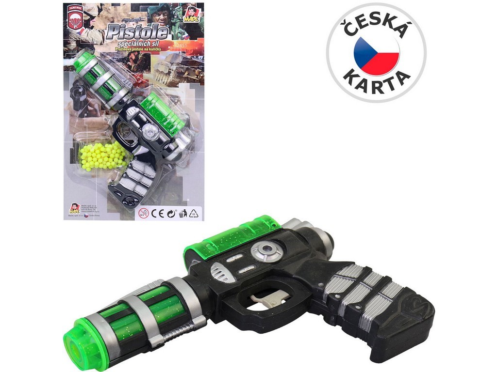 Pistole na kuličky, 18 cm, s náhradními kuličkami, 100 ksHračka je určena pro děti 3+.Rozměr hračky je 18 cm.Materiál hračky je plast.Balení hračky je blister card.Produkt je určený pro kluky. przeczytaj całość