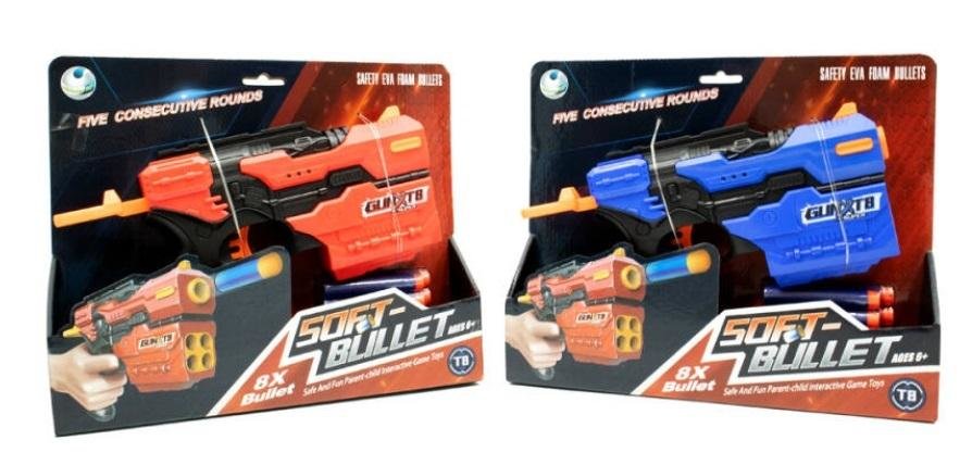 Mix wzorów, towar wysyłany losowo.- Pistolet dostępny jest w dwóch kolorach (Czerwonym i niebieskim) - W zestawie znajduje się 8x miękkich pocisków - Pistolet posiada 4x miejsca na pociski, oraz 1x lufę wylotową przeczytaj całość