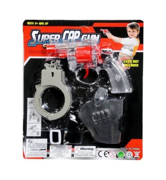 Zabawka pistolet na spłonkę w zestawie wraz z kajdankami.#&Produkt zapakowany w kartonowa podstawke z przezroczystym kloszem. #&Zabawka przeznaczona dla dzieci od 3 lat. #&Podane wymiary są wymiarami opakowania. przeczytaj całość