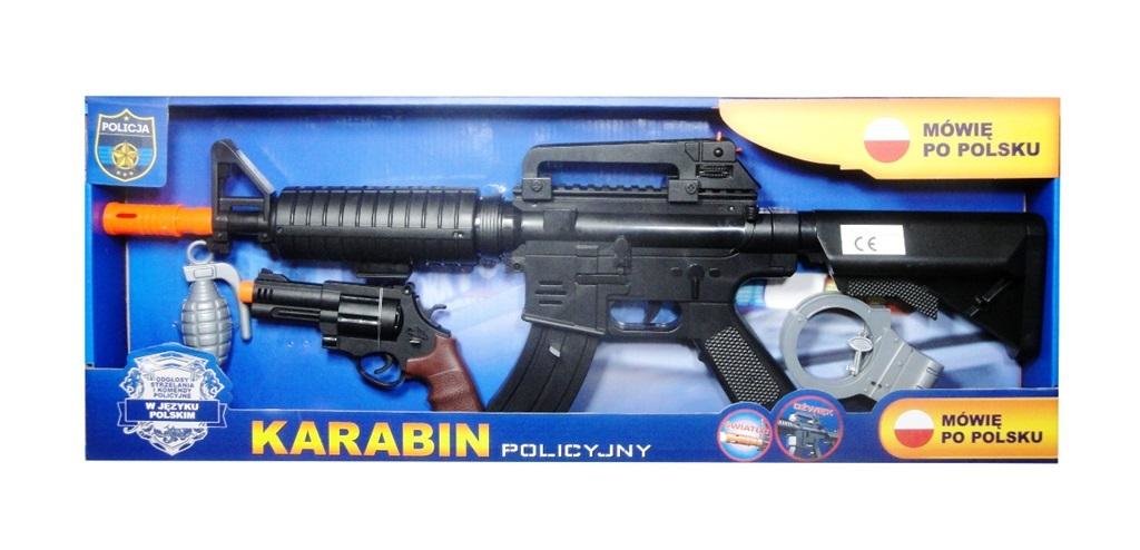 Karabin policyjny z dźwiękami syreny policyjnej, strzelania, przeładowania broni oraz komendami policyjnymi w języku polskim: "Do wszystkich jednostek: Zgłaszam napad, ruszajmy do akcji", "Policja! Ręce do góry", "Stój, bo będę strzelał", "poddaj się, rzuć broń! Jesteś otoczony", "Jesteś...