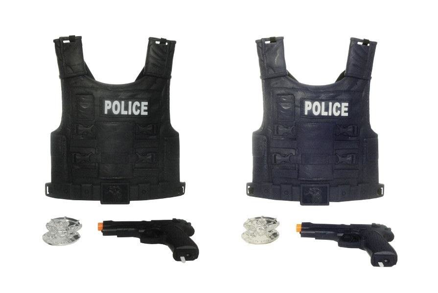 Zabawka z dźwiękami syreny policyjnej, strzelania, przeładowania broni oraz komendami policyjnymi w języku polskim: "Do wszystkich jednostek: Zgłaszam napad, ruszajmy do akcji", "Policja! Ręce do góry", "Stój, bo będę strzelał", "poddaj się, rzuć broń! Jesteś otoczony", "Jesteś aresztowany,...