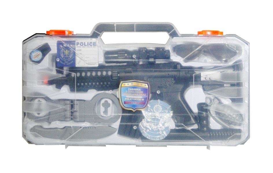 Zestaw dla małego policjanta w podręcznej walizce. W skład zestawu wchodzi m.in.: karabin, granat, kajdanki (z kluczem), okulary, gwizdek i odznaka. zestaw niezastąiony podczas zabawy w policjantów i złodziei. Produkt zapakowany w plastikową walizkę. Częśc elementów działa na baterie typu AA.... przeczytaj całość