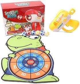 W zestawie: pistolet, tarcza z haczykiem do zawieszenia na naklejkę, 6 piłek na rzep. Funkcje: ładowanie pistoletu - piłki wkłada się do pistoletu przez klapkę na górze zabawki, strzelanie: pociągnąć za zawleczkę z tyłu pistoletu, przechylić do do przodu tak, by kulka wpadła do komory wystrzału,...