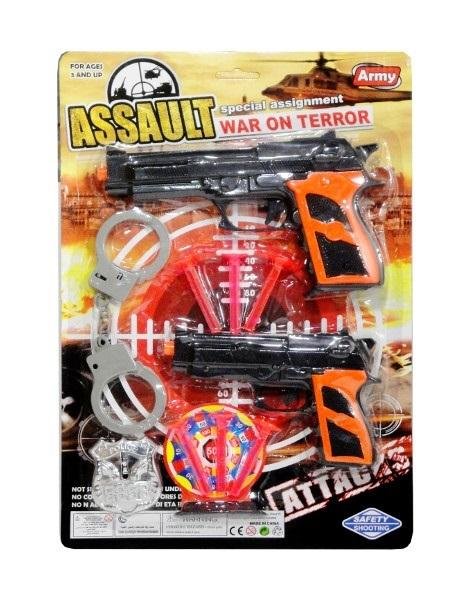 Zestaw 2 pistoletów wraz z 6 strzałkami i kajdankami. Sprawdzi się podczas balików i będzie stanowił uzupełnienie stroju np. małego policjanta lub cowboya. Produkt zapakowany w kartonowa podstawkę z przezroczystym kloszem. Zabawka przeznaczona dla dzieci od 3 lat. przeczytaj całość