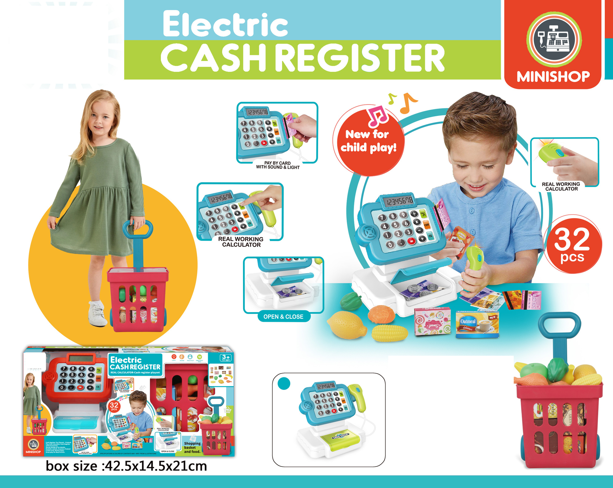 Kasa z wózkiem na zakupy. Wymiary kasy 19,5x13,8x15,8 cm, wózka 18x11x43 cm. Efekty świetlne i dźwiękowe. 2xAA baterie w zestawie. przeczytaj całość