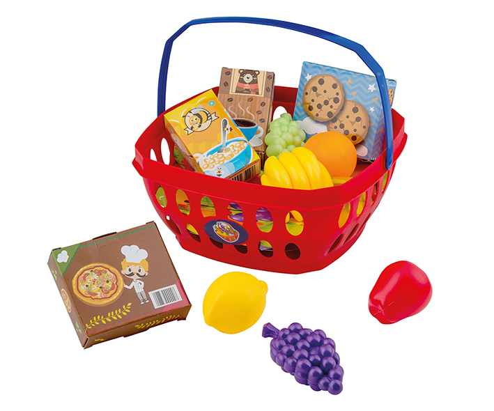 Plastový nákupní košík s maketami potravin. Celkem 11 ks. 23,5 x 23 x 11,5 cm przeczytaj całość