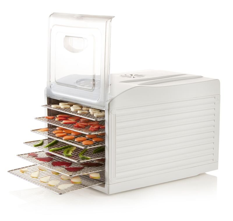 Díky průhlednému víku, nastavitelnému časovači a regulaci teploty budete mít vždy sušení ovoce i jiných potravin plně pod kontrolou. Během sušení můžete i snadno dvířka vysunout jen na výšku prvního sušícího plata a zkontrolovat jak sušení probíhá bez úniku tepla. Technologie sušení rozvodem...