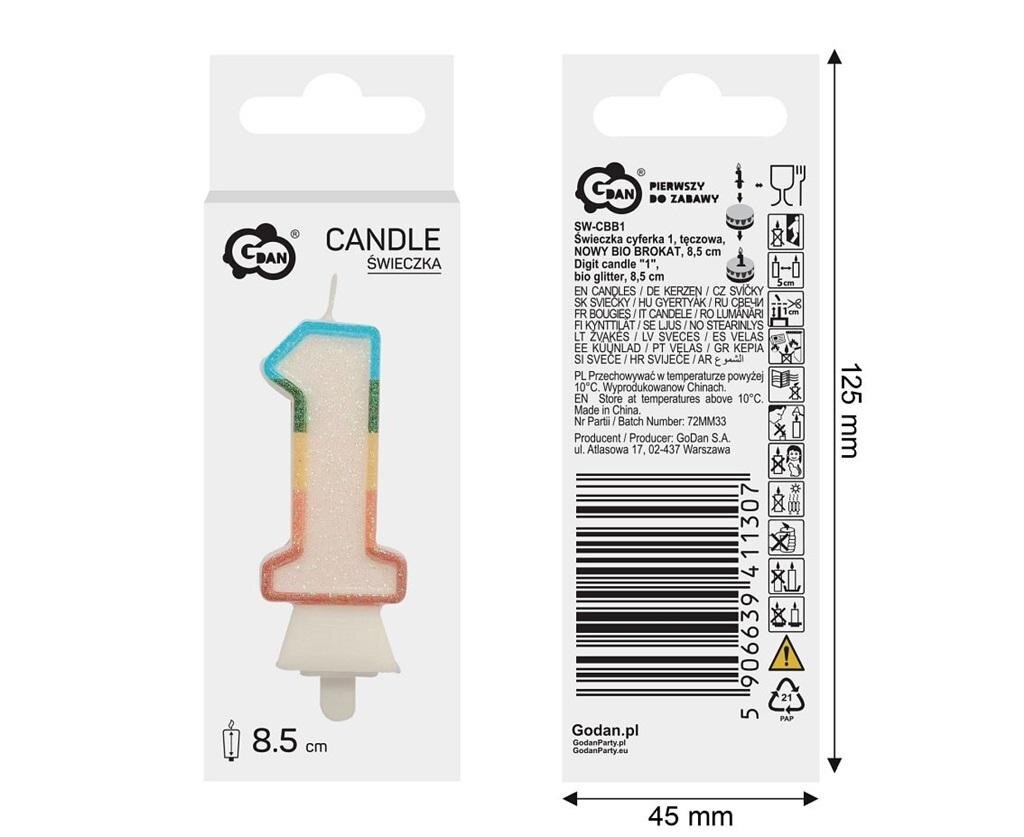 ŚWIECZKA CYFRA 1, TĘCZOWA, BIO BROKAT Wysokość świeczki: 8,5 cm Wysokość świeczki z podstawką: 10 cm Rodzaj: cyfra Kolor: tęczowy Element ozdobny: bio brokat Ilość: 1 szt. Producent: Godan S.A. przeczytaj całość