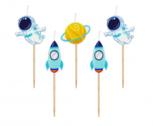 Kolor: wielobarwny Wzór: rakieta kosmiczna, planeta, astronauta Wysokość świeczek: ok. 4 cm Całkowita wysokość (z patyczkiem): ok. 7,5 cm Ilość sztuk w opakowaniu: 5 przeczytaj całość