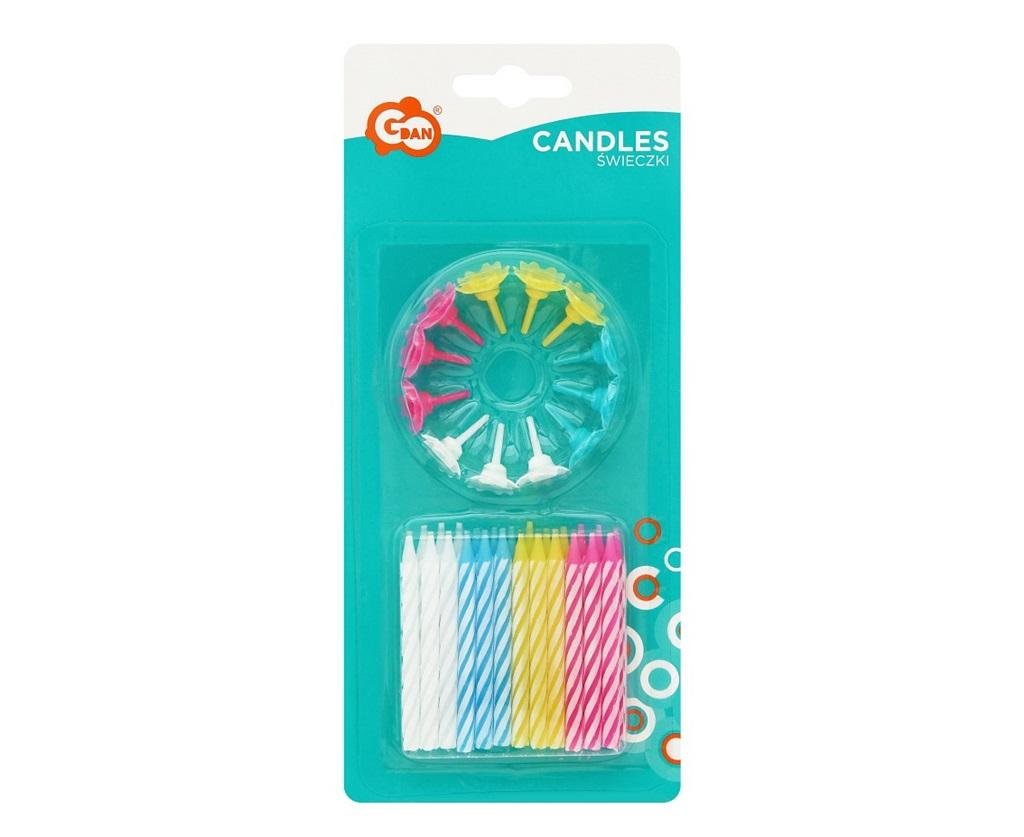 ŚWIECZKI URODZINOWE 4 KOLORY SPIRALNE, 24/12 SZT.Wysokość: 6 cmWzór: paskiKolor: żółty, biały, różowy, niebieskiIlość: 24/12 szt.Producent: Godan S.A. przeczytaj całość