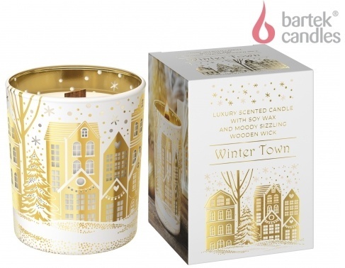 Vonná svíčka ve skle 200g s dřevěným knotem v krabičce - Winter Town je součástí kolekce polské značky Bartek Candles przeczytaj całość