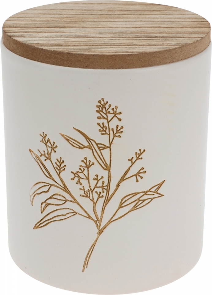 Vonná svíčka v keramickém obalu s rytinou květiny a dřevěným víčkem. Vůně pomeranče.Materiál: keramika, pěnový voskRozměry:10x9 cm przeczytaj całość