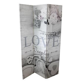 Krásný paravan - LOVE. Paravan má šířku 120,6 cm, tloušťku 2 cm, výšku 180 cm. Barva : šedá. Materiál : kombinace plátno, dřevo. przeczytaj całość