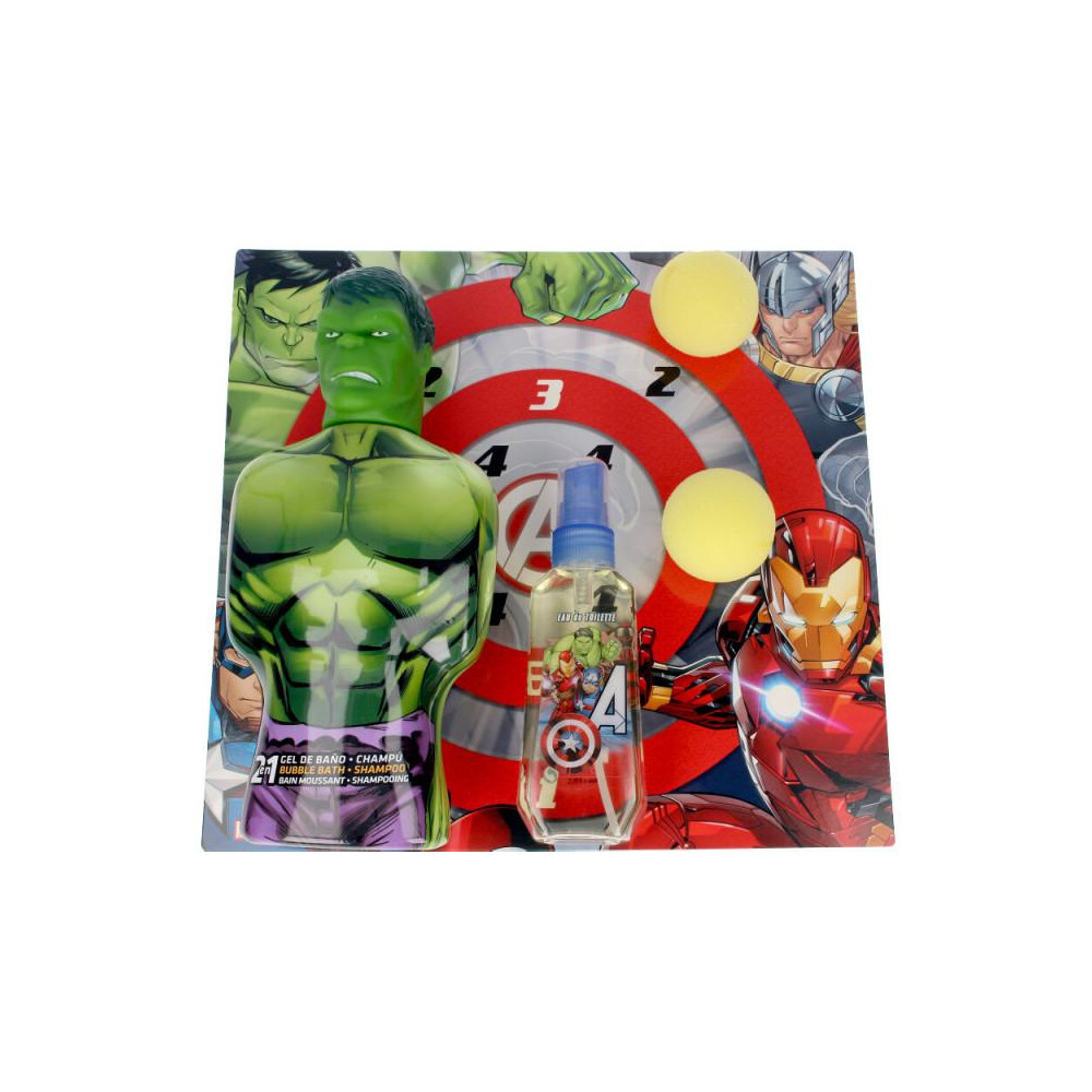 Dárkový set obsahující 90 ml toaletní voda, 2v1 šampon a pěna do koupele ve tvaru postavy Hulk z Avengers a terč se dvěma pěnovými míčky przeczytaj całość