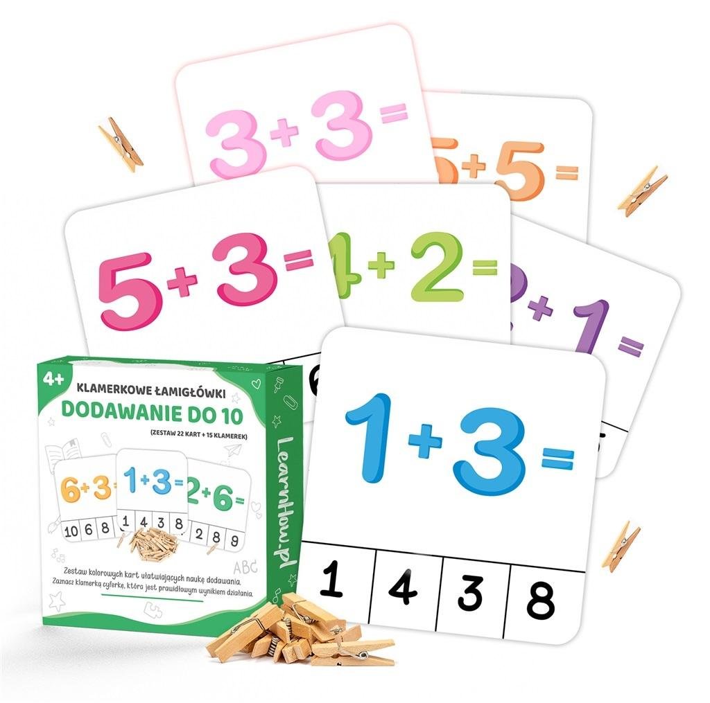Zestaw składa się z 22 kart oraz 15 klamerek.Zadanie polega na oznaczaniu przy pomocy klamerek poprawnego wyniku dodawania umieszczonego na karcie.Karty o rozmiarze 10x10 cm, są zalaminowane.Cały zestaw jest spakowany w małe pudełeczko, w którym możemy również przechowywać zestaw. przeczytaj całość
