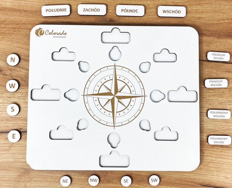 Drewniana tablica edukacyjna przedstawiająca główne kierunki geograficzne (N-północ, S-południe, E-wschód, W-zachód) oraz pośrednie kierunki geograficzne (NE-północny wschód, SE-południowy wschód, SW-południowy zachód, NW-północny zachód).Nazwy kierunków geograficznych jak również ich skróty...