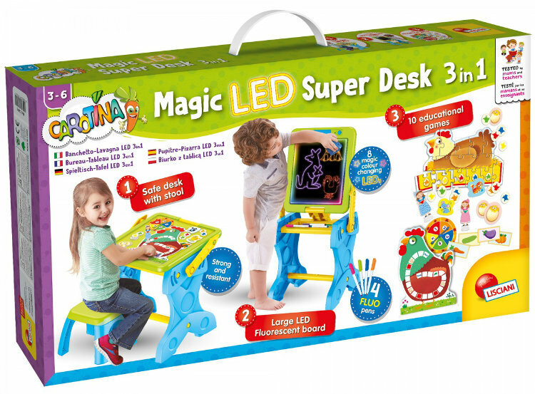 Wyjątkowy zestaw edukacyjny 3 w 1 marki Carotina - zawiera biurko aktywnego przedszkolaka razem ze specjalnym stołkiem oraz tablicę LED. Podświetla się ona kilkoma kolorami, a dzięki 4 markerom fluorescencyjnym można na niej tworzyć niecodzienne rysunki, kóre się podświetlają! Po skończonej...