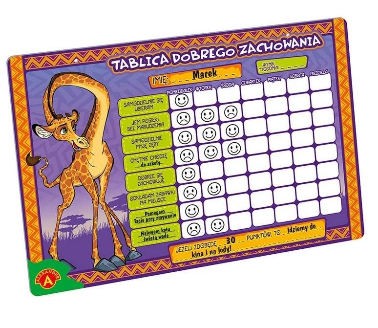 Wyjątkowa pomoc wychowawcza. Tablica pozwala na notowanie zachowania dziecka w postaci punktów dodatkach i ujemnych (zaznaczanych za pomocą symboli np. uśmiechniętych i smutnych ,,buziek").Odpowiednia ilość zebranych punktów pozwala dziecku zdobyć ustaloną wcześniej nagrodę. Oceniane...