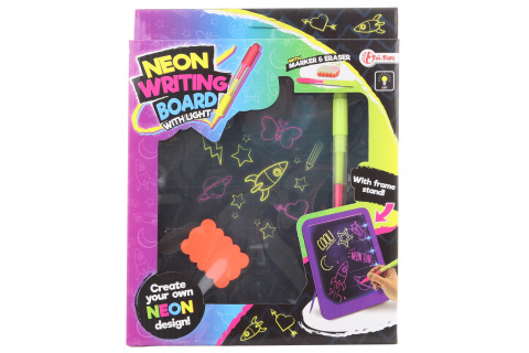 Neonová kreslící tabulka. Balení obsahuje tabulku, dvoubarevnou fixu a gumu. Napájení na 3 AA baterie ( nejsou součástí balení). Rozměr balení 20,5 x 27 cm. Vhodné od 3+ przeczytaj całość