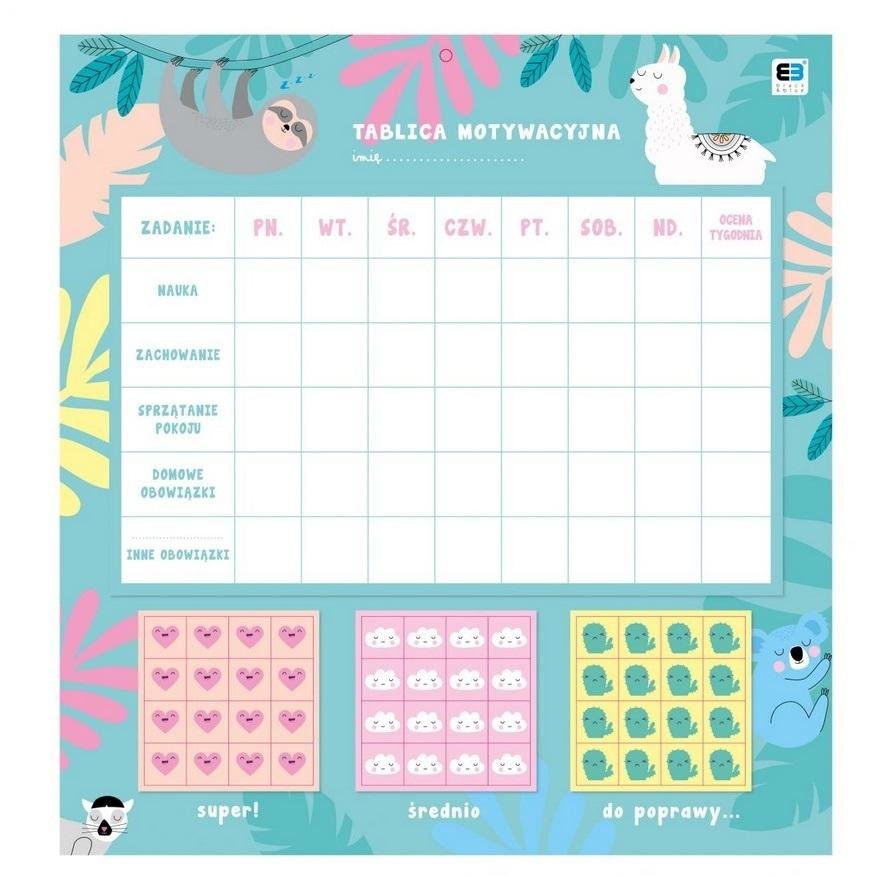 Tablica motywacyjna.Podział na dni tygodnia i zadania plus trzy rodzaje kolorowych karteczek z ocenami na: super, średnio, do poprawy. przeczytaj całość