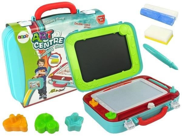 Dwustronna Tablica Kredowa Do Zmazywania w Walizce MagnesyWielofunkcyjna tablica z możliwością rysowania kredą i pisakami sprawi radość każdemu malcowi, który uwielbia rysować. Rozwinie w nim zmysł plastyczny oraz wyobraźnie. Rysowanie na tablicy bardzo pozytywnie wpłynie na rozwój dziecka....