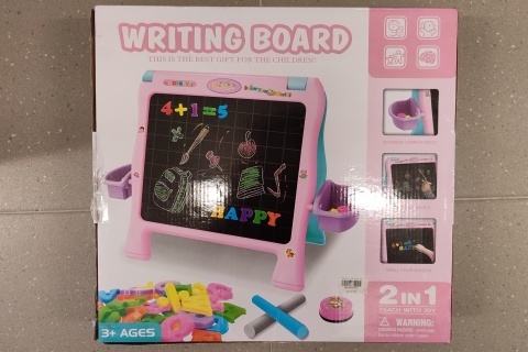 Magnetyczna tablica z akcesoriami. Z jednej strony jest czarna tablica magnetyczna, a z drugiej bia2a tablica, po ktrej mocna pisa7 markerem. W zestawie znajduj5 si9 2 specjalne markery, g5beczka i magnetyczne literki. Wymiary opakowania 41 x 38,5 x 7,5 cm. Wiek 3+ przeczytaj całość
