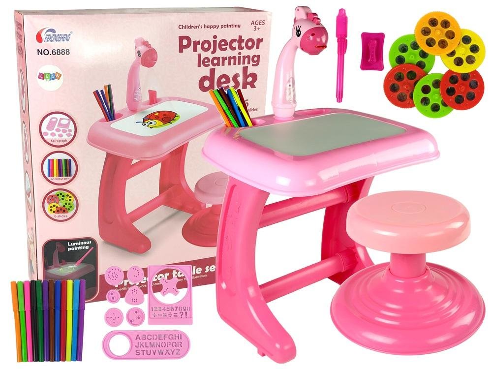 Stolik Tablica Do Rysowania Krzesełko Projektor Różowy Pisaki Obrazki Wielofunkcyjna tablica z możliwością pisakami sprawi radość każdemu malcowi, który uwielbia rysować. Rozwinie w nim zmysł plastyczny, wyobraźnie oraz funkcje ręki i dokładność. Rysowanie na tablicy bardzo pozytywnie wpłynie na...