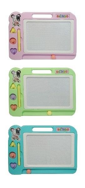Pastelowy znikopis pisania i rysowania. Znikopis posiada 3 stempelki i długopis. Malunki można łatwo usunąć, przesuwając suwak zmazujący. Zabawka przeznaczona dla dzieci w wieku powyżej 3 lat. Produkt występuje w kilku wersjach kolorystycznych, wybierany losowo. Cena dotyczy jednej sztuki. Podane wymiary stanowią wymiar opakowania. Produkt zapakowany w przezroczysty worek.