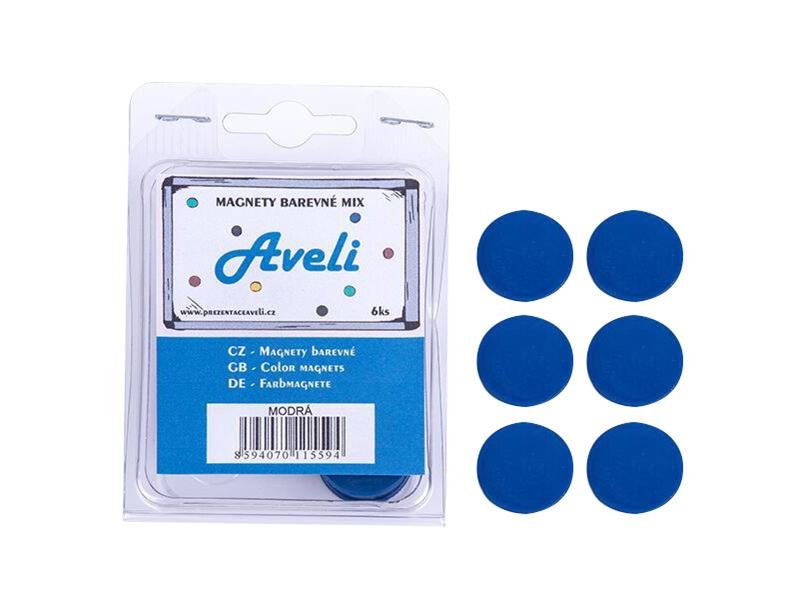 Magnety AVELI BLUE Magnety pro tabule Aveli v barevných rozlišeních. Balení 6 kusů magnetů v černé barvě.Vlastnosti:- Průměr 24 mm- Barevný plastový povrch- Kulatý tvar- Vhodné k uchycení dokumentů, výkresů i fotek na magnetických plochách przeczytaj całość