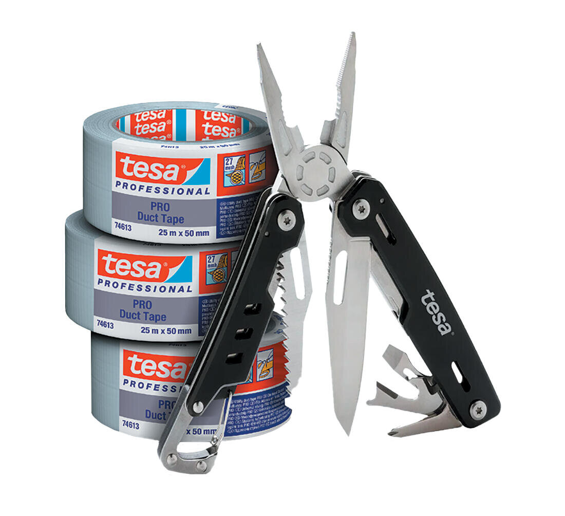 PROMO balení tesa® opravná páska 3ks + multifunkční nástroj Skládá se z PET/bavlněného textilního nosiče o hustotě 27 ok na čtvereční palec a lepidlem z přírodního kaučuku. Dobrá přilnavost i na drsné povrchy, snadno odtrhnutelná rukou, odpuzuje vodu, flexibilní. Má typické vlastnosti na opravu,...