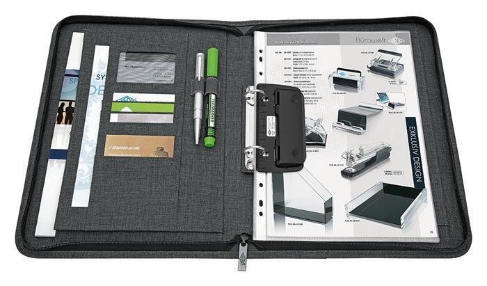 Teczka menedżerska z przejrzystą organizacją niezbędnych materiałów na spotkanie lub inne ważne zebranie. Cechy: mechanizm 2-ringowy (Ø 30 mm, wysokość wkładu 20 mm); na standardowy i spiralny notes; wiele kieszeni; dwie elastyczne taśmy; składana przegroda A4 na miejsce na karty; zamknięcie na zamek błyskawiczny; łatwe w utrzymaniu; Kolor: szary Materiał: poliester; struktura materiału przypominająca płótno; Wymiary: 28x4,7x35,5 cm