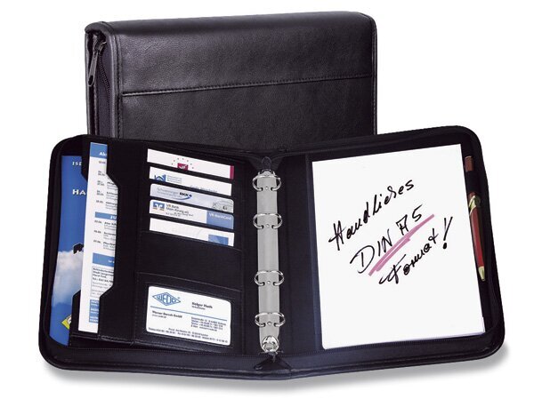 Nowoczesna i zarazem elegancka teczka odpowiednia na dokumenty formatu A5. Posiada mechanizm na 4 ringi (średnica ringów 30 mm, wysokość wypełnienia 20 mm), kieszeń na bloczek w rozmiarze A5, kieszeń na dokumenty, 5 kieszonek na karty oraz przezroczystą kieszonkę na wizytówkę, długopis można przymocować za pomocą elastycznej pętelki.