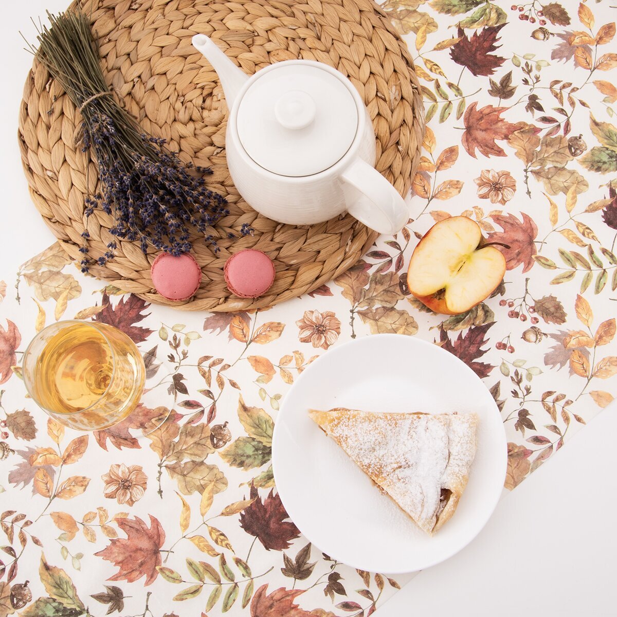 Papírový ubrus běhoun s dekorem na střed stolu ozdobí vaši domácnost při oslavě nebo na podzimní dekoraci. Je to moderní a praktický doplněk, který doladí prostřený stůl. Použít jej můžete také na konferenční stolek. Materiál: papír (1 vrstva, gramáž 55 g/m2). Rozměry: 180x40 cm. Ostřihnutím můžete upravit velikost. Při ušpinění odpadá starost s čištěním, praním.