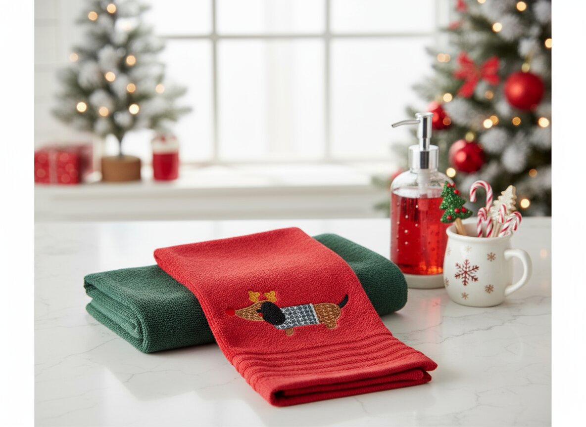 Absorpční ručníky - Měkká a přírodní bavlna - Vzor jezevčíka - Sada 2 ks - Vánoční ručníky 2 ks vínové s jezevčíkemSada ručníků má krásnou vínovou barvu a roztomilou nášivku s jezevčíkem. Jezevčík na ručnících má na sobě svetr a sobí nos a rohy. Ručník s hravým motivem vykouzlí úsměv a radost i v...