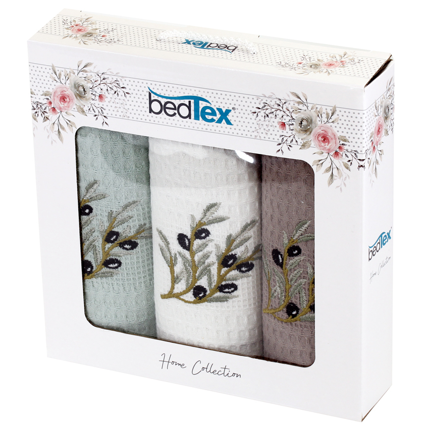 Dárková sada 3 ks vaflových utěrek se vzorem olivových větvičekDárková sada vaflových utěrek, je vyrobena ze 100% bavlnyVaflový vzor je textilie s plastickým povrchem, kdy hustě provázaná místa tvoří ve tkanině prohloubeninyTento výrobek je vysoce savýUtěrky jsou v balení ve třech barvách a to...