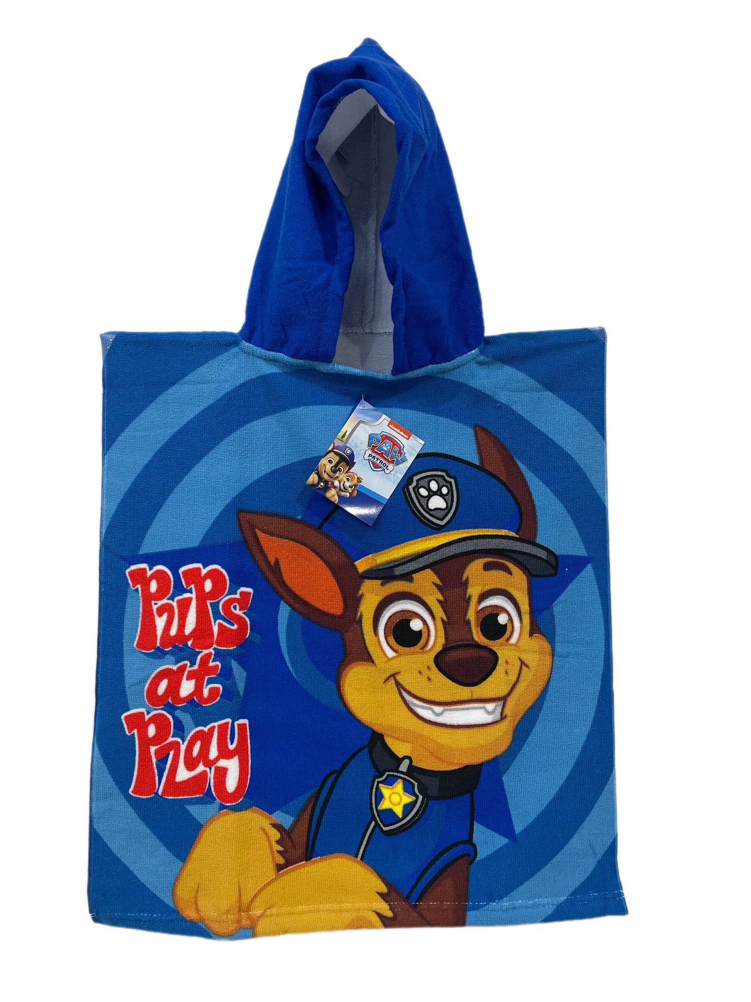 Duży niebieski ręcznik wykonany jako poncho z grafiką psich ratowników z serialu animowanego Psi Patrol. Poncho jest odpowiednim prezentem dla każdego mniejszego i większego fana.