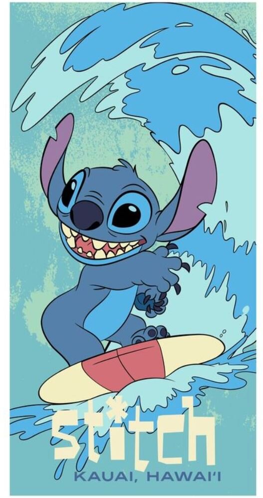 Atrakcyjny niebieski ręcznik z motywem Stitcha surfującego. Licencyjny ręcznik kąpielowy ucieszy wszystkich małych i dużych miłośników bajki Lilo & Stitch, a przede wszystkim fanów postaci kosmity Stitcha.