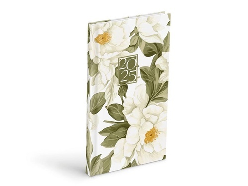Týdenní diář pro rok 2025 s motivem bílých květů. Je výborným pomocníkem při organizování Vašeho času. Povrch obálky je vyroben z lesklého lamina. Diář má odtrhávatelný spodní rožek, který umožní rychlé nalistování aktuálního týdne. przeczytaj całość