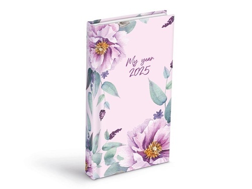 Denní diář pro rok 2025 s krásnou obálkou v jemné růžové barvě. Povrch diáře je zdoben nádhernými květinovými motivy v odstínech fialové a zelené, které dodávají diáři romantický a elegantní vzhled. Obálka je vyrobena z lesklého lamina a je příjemná na dotek. Díky praktickému a skladnému rozměru poskytuje dostatek místa na poznámky, aniž by zabíral příliš prostoru.