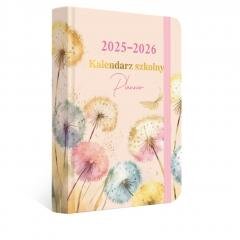 "Kalendarz książkowy. Układ kalendarium dzienny. Kalendarz szyty, 336 str, format 120 mm x 170 mm. Oprawa twarda ze złoceniem, zadruk full kolor, kalendarium od września 2025 do sierpnia 2026, rozkład kalendarium dzienny, sobota i niedziela na 1 stronie, Kalendarz ze wstążką/zakładką.W kalendarzu: plan lekcji, skrócony kalendarz na rok 2025 oraz 2026, dodatkowy planer miesięczny, mapa ferii."