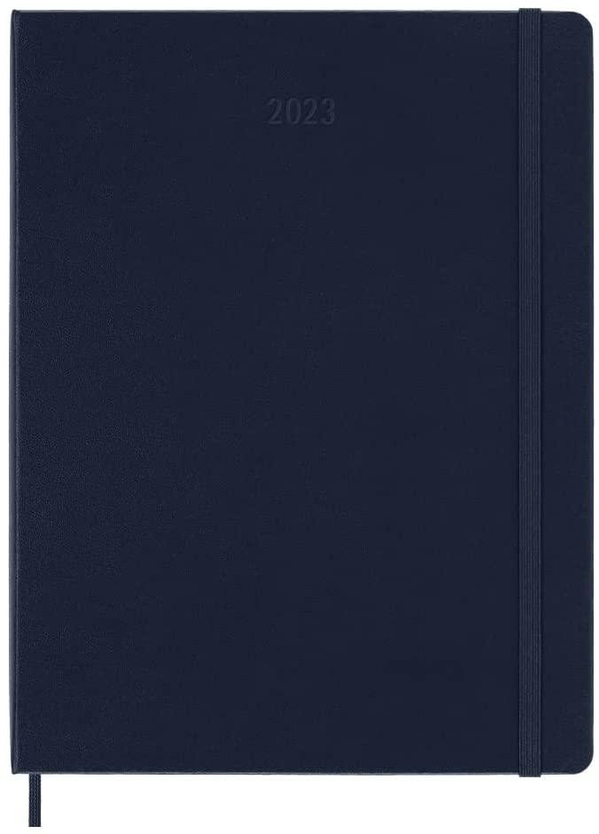 Extra velký modrý plánovací zápisník na rok 2023. Na levé straně jsou dny v týdnu a na pravé linkovaná stránka na poznámky. Zápisník má tvrdou, ve hřbetu šitou vazbu. Obepíná ho pružná páska proti samovolnému otevírání. Obsahuje praktickou vnitřní kapsu, textilní záložku a 295 barevných samolepek. Papír s gramáží 70 g/m2 neobsahuje kyselin.
