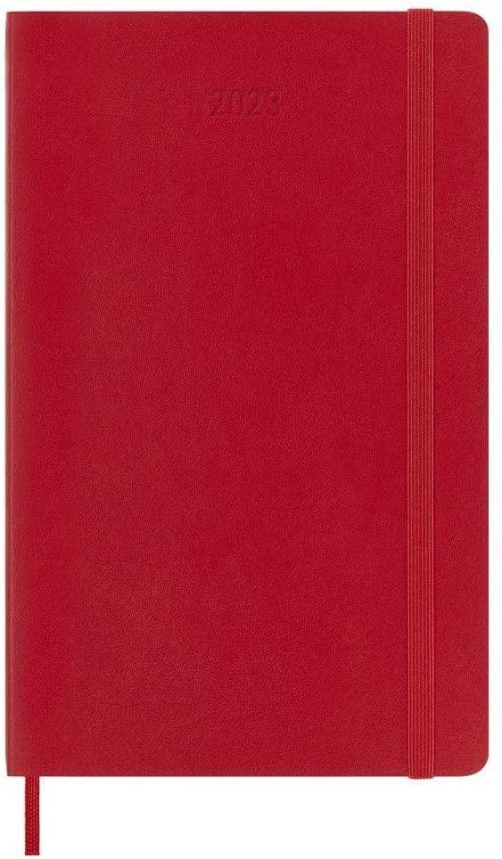 Velký červený plánovací zápisník na rok 2023. Na levé straně jsou dny v týdnu a na pravé linkovaná stránka na poznámky. Diář má měkkou vazbu v kartonových deskách. Obepíná ho pružná páska proti samovolnému otevírání. Obsahuje praktickou vnitřní kapsu, textilní záložku a 295 barevných samolepek. Papír s gramáží 70 g/m2 neobsahuje kyseliny.