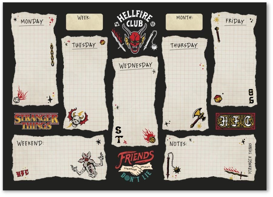 Oficiální stolní plánovač z katalogu kancelářských a dárkových produktů s grafikou, fotografiemi a licencí populárního amerického sci-fi mysteriózního hororového seriálu Stranger Things. Zboží je legálně licencováno a prodáváno se souhlasem vlastníků licenčních práv.Stolní týdenní plánovací blok...