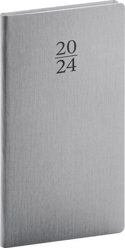 Kapesní diář Capys 2024 ve stříbrné barvě. Povrch imitující jemnou strukturu plátna je vhodný pro ražbu přes fólii. Atraktivní barevný odstín doplňuje ražba letopočtu. Týdenní rozvrh s česko-slovenským kalendáriem a doplňkovou angličtinou, němčinou, maďarštinou a ruštinou. • kalendárium od...