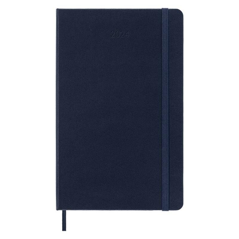 Klasický velký modrý denní diář na rok 2024. Na každý den stránka pro poznámky a schůzky. Diář má pevnou, ve hřbetu šitou vazbu v kartonových deskách. Obepíná ho pružná páska proti samovolnému otevírání. Obsahuje praktickou vnitřní kapsu na vizitky a dokumenty, textilní záložku, 3 sady...