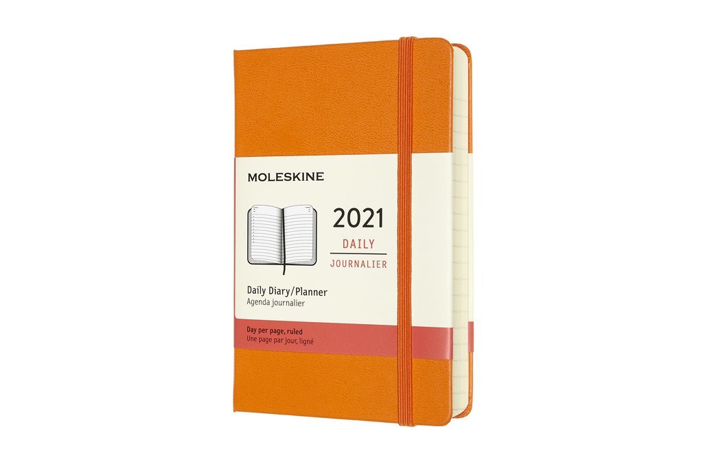Klasický oranžový denní diář kapesní velikosti na rok 2021. Na každý den stránka pro poznámky a schůzky. Diář má pevnou, ve hřbetu šitou vazbu v kartonových deskách. Obepíná ho pružná páska proti samovolnému otevírání. Obsahuje praktickou vnitřní kapsu na vizitky a dokumenty, textilní záložku a...