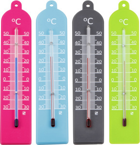 Klasyczny pokojowy termometr, wymiary 177 × 34 mm, plastikowy, różne wersje kolorystyczne. przeczytaj całość