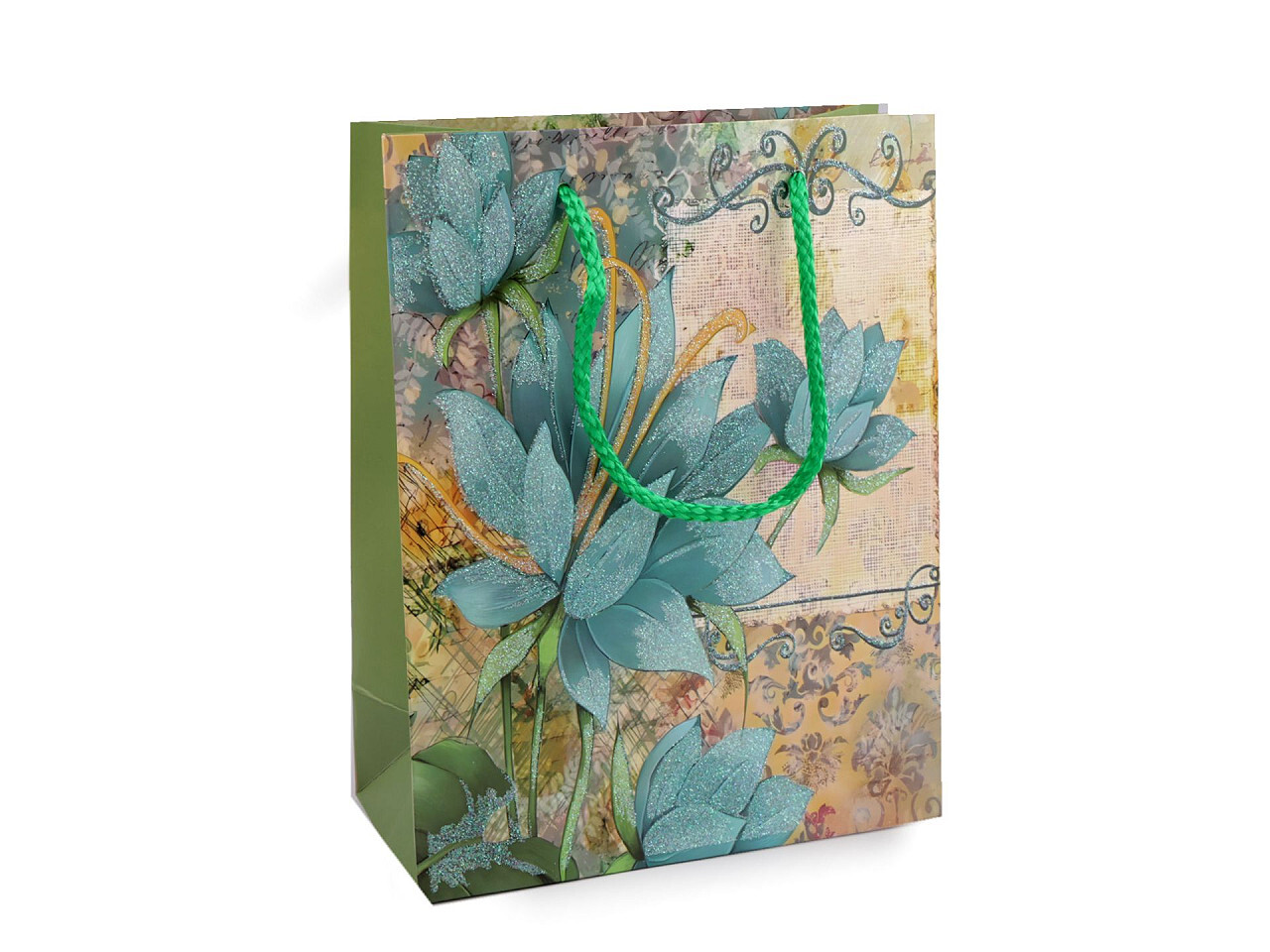 Dárková taška s glitry květy - 4 ks - 3 zelená šalvěj světlá