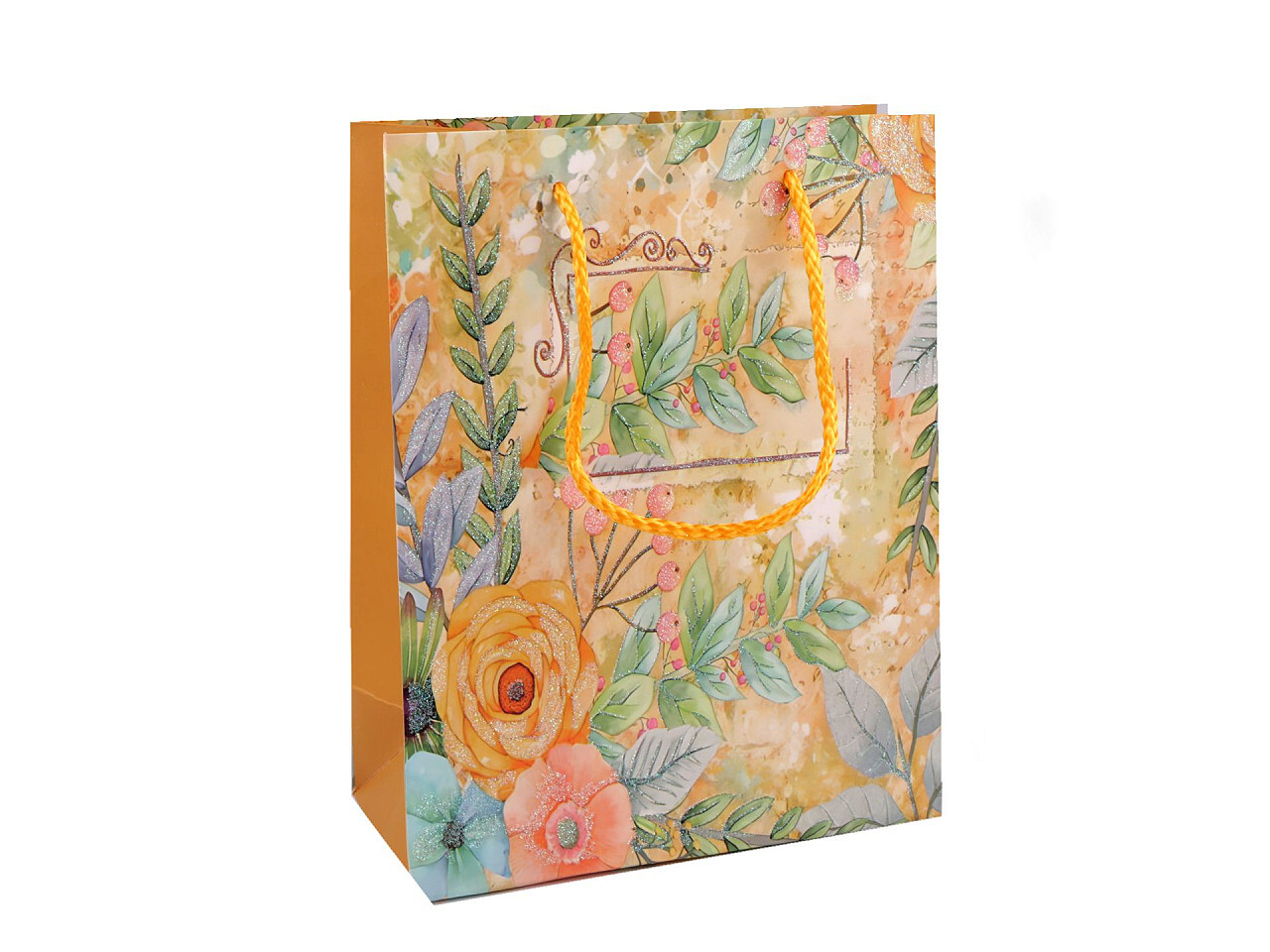 Dárková taška s květinovým motivem je díky glitrů na přední straně velice efektní. Je ideální pro všechny, kteří chtějí rychle zabalit dárek. Je vyrobená z kvalitního křídového papíru, potisk je z obou stran. Ucha tašky jsou ze spletené šňůry. przeczytaj całość